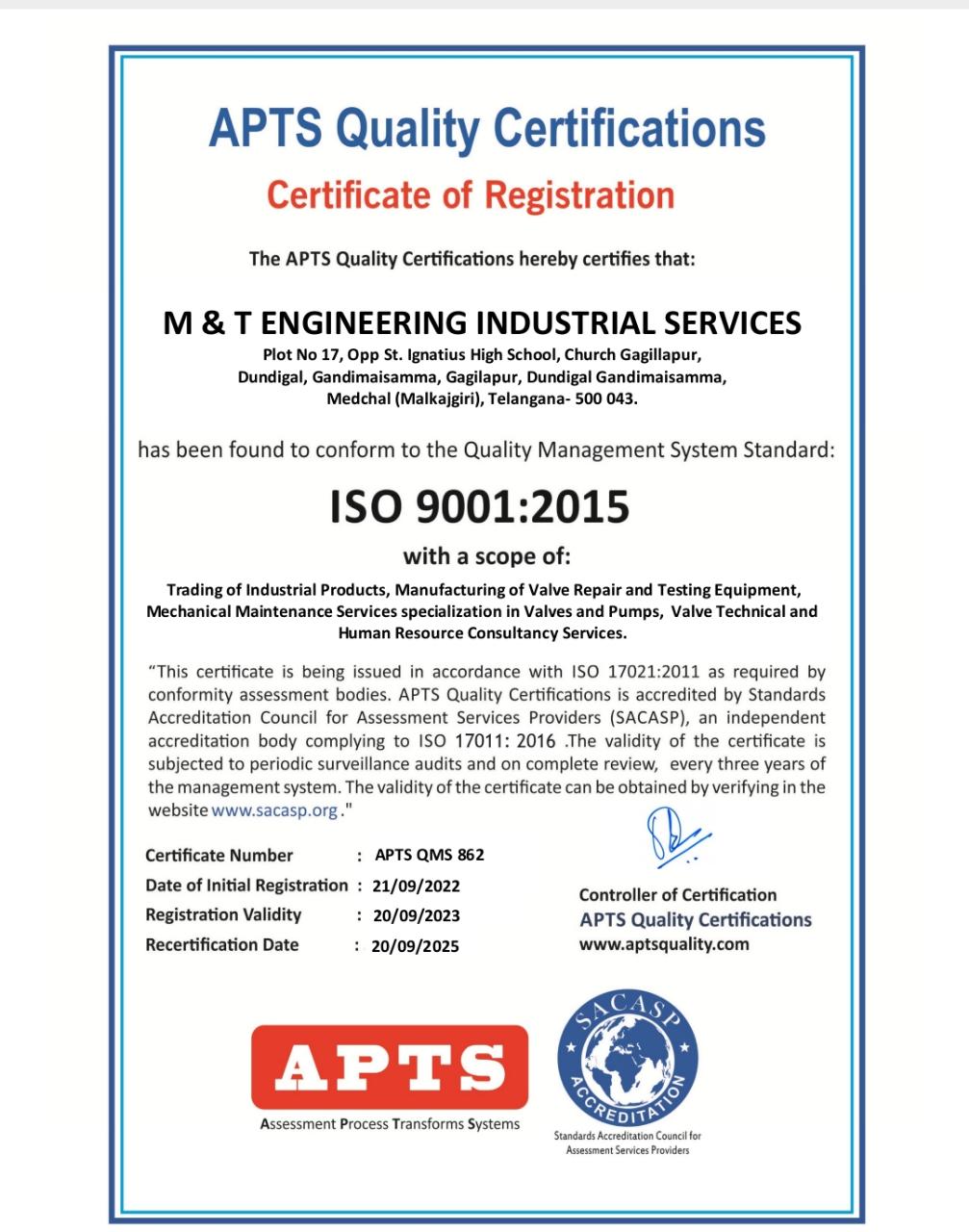 MTEIS documented quality management system covers the requirements of ISO 9001:2015 Standard and Internal Standard Specifications API/ANSI/ASME related to Valve Repair Services.